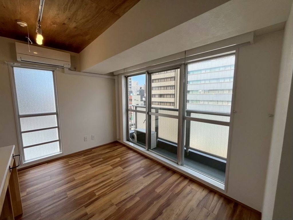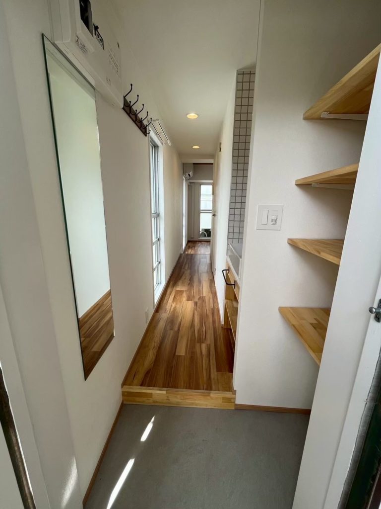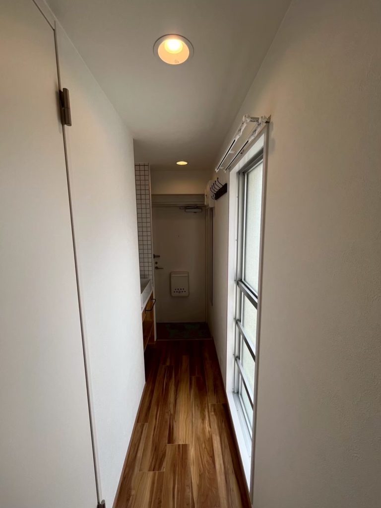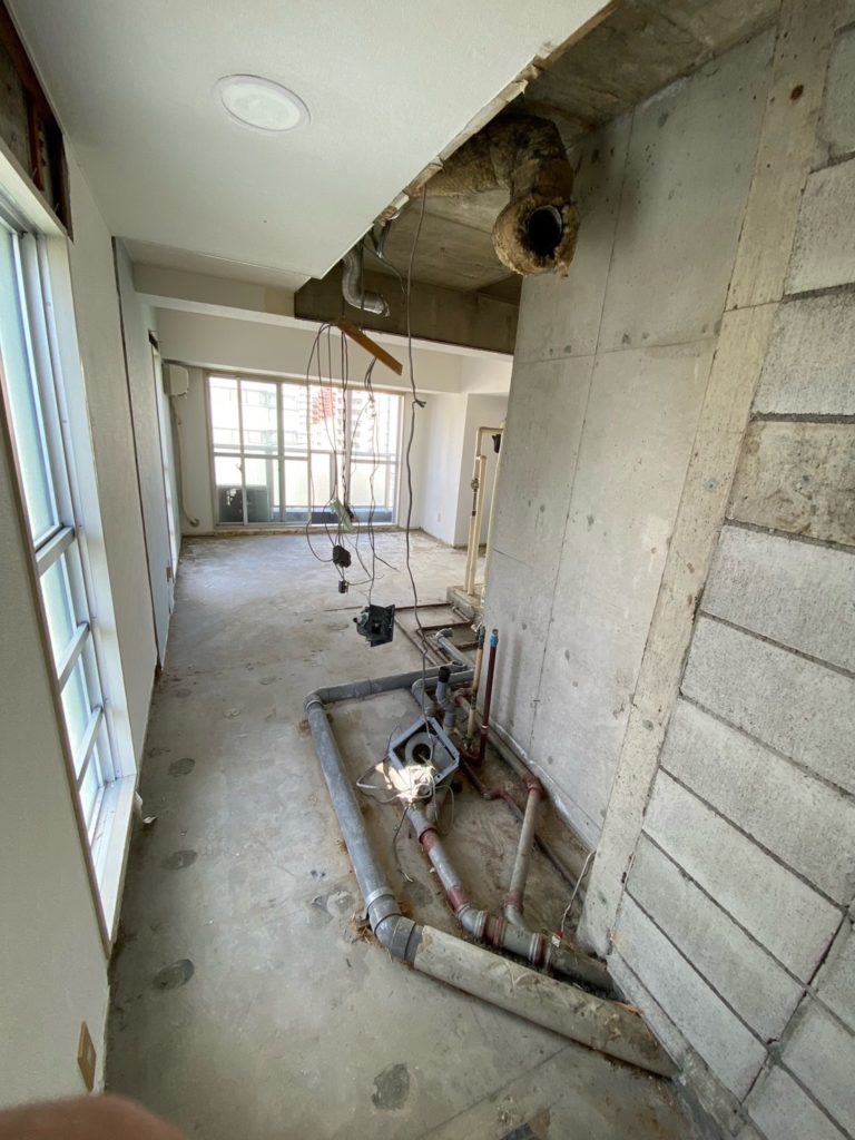スケルトン状態からのフルリノベーション事例です。無機質だったコンクリートと配管がむき出しの空間を、一から再構築。限られた奥行きを活かし、ナチュラルウッドのフローリングと白を基調とした壁で、明るく奥行きを感じるデザインに仕上げました。