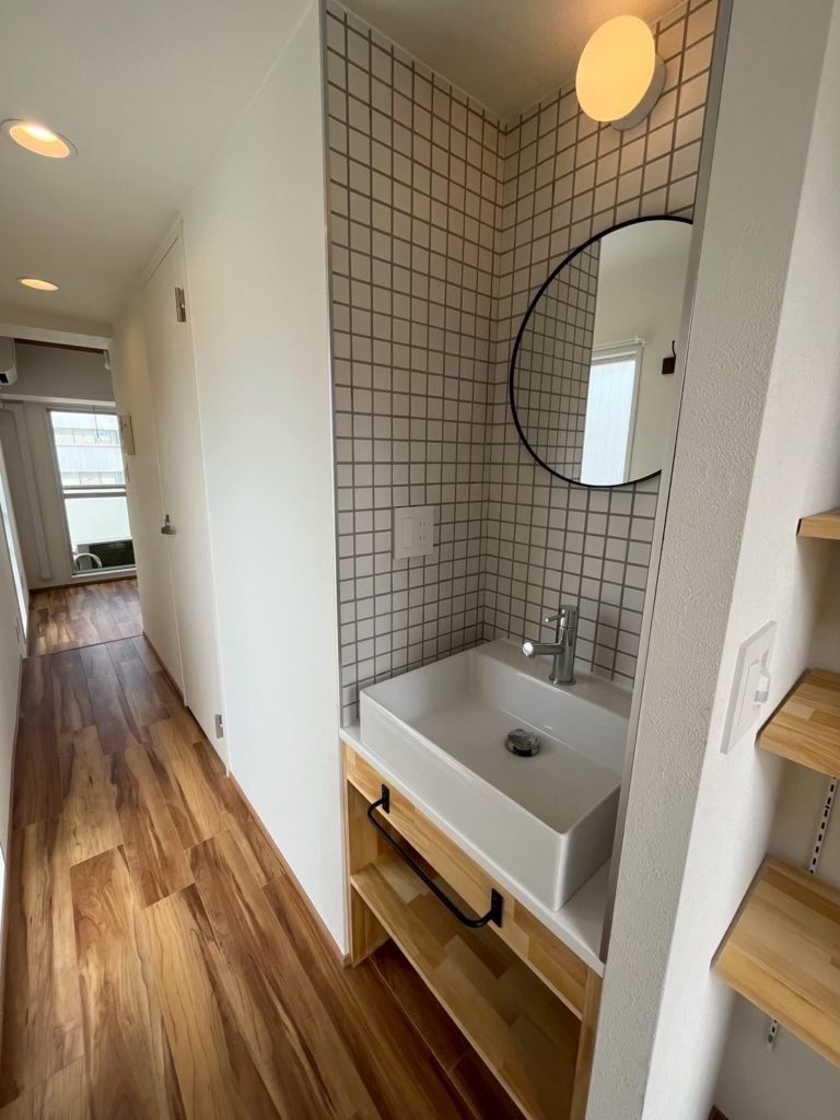 細部まで無駄を省いたレイアウトと、造作棚や鏡などの機能的なアクセントが心地よさを演出しています。構造上の制約をクリアしながら、配管や照明の配置に悩まされましたが無事綺麗に収まりました。特に電気温水器だった現場ですのでスマートに折れ戸の裏に隠して日常生活では目に入らないようにし、シンプルながら温もりのある空間へと生まれ変わった一例です。